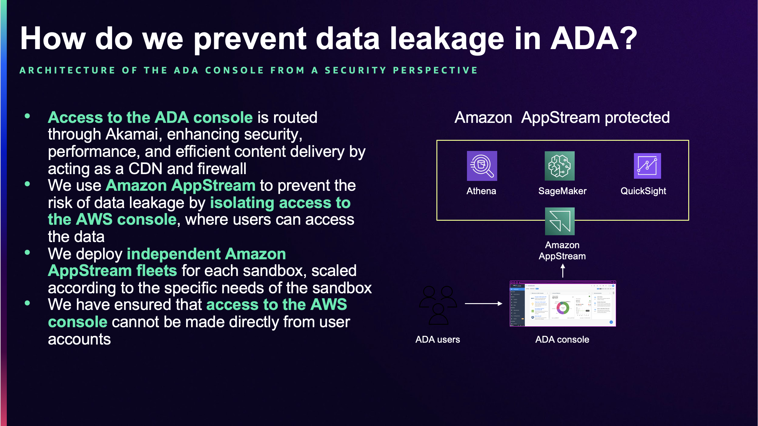 BBVA seamlessly integrates access control and authentication into BBVA’s security framework. When users access AWS through the ADA console, they are automatically redirected to secure AppStream sessions. The security framework restricts streaming sessions to federated users only, while implementing access limitations to specific VPCs through AWS IAM policy conditions. These controls are fully integrated with BBVA’s existing authentication mechanisms, ensuring a consistent and secure access model.