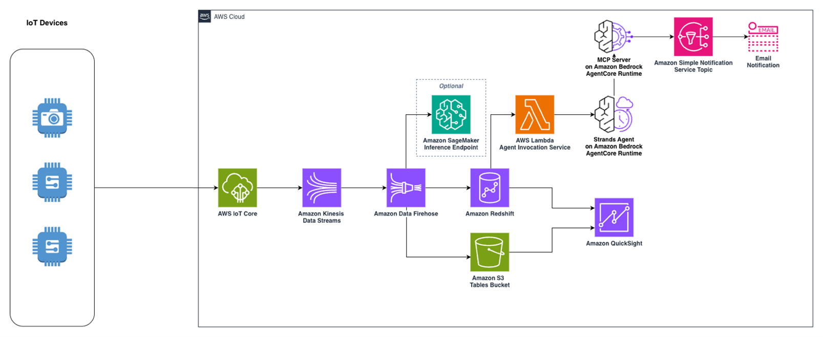 - Optional Amazon SageMaker provides real-time machine learning predictions for predictive maintenance and personalized recommendations.