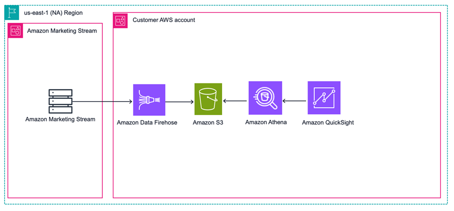 Figure 2 shows Amazon Marketing Stream delivering data directly into Amazon Data Firehose, which is stored in an S3 bucket. The data can then be queried using Amazon Athena and business intelligent dashboards built within Amazon QuickSight.