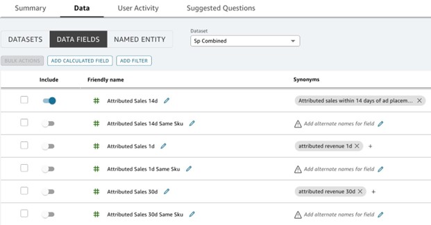 Please note that to enable natural language querying on Amazon Marketing Stream data, you will need to create a Q Topic and populate it with metadata. You can consult our documentation on Sponsored Products performance datasets to understand how best to achieve this. The following screenshot (Figure 4) shows an example of a topic field definition.