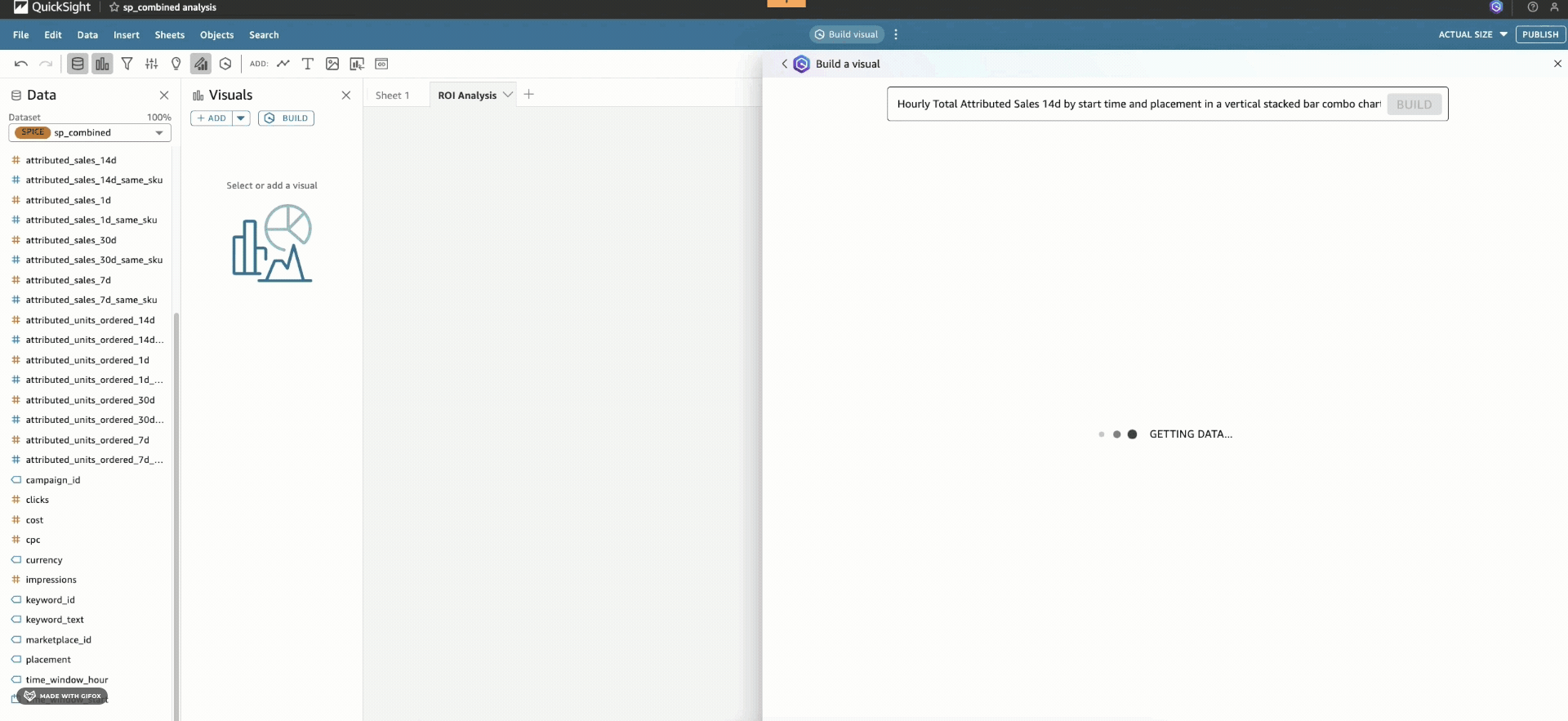 Business Intelligence is a primary way advertisers derive value from Amazon Marketing Stream data. QuickSight offers seamless integration with your marketing data hosted on AWS and provides generative AI-powered dashboarding and insight creation capabilities through Amazon Q in QuickSight. The animation in Figure 3 demonstrates how users can create rich and interactive ad placement analysis dashboards using natural language.