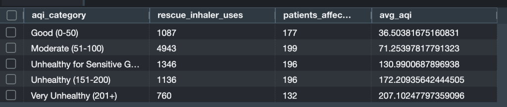 To gain these insights, clinicians can formulate a straightforward question: Find the correlation between air quality measurements and rescue inhaler usage across different regions, showing which locations have the strongest relationship between poor air quality and medication use.