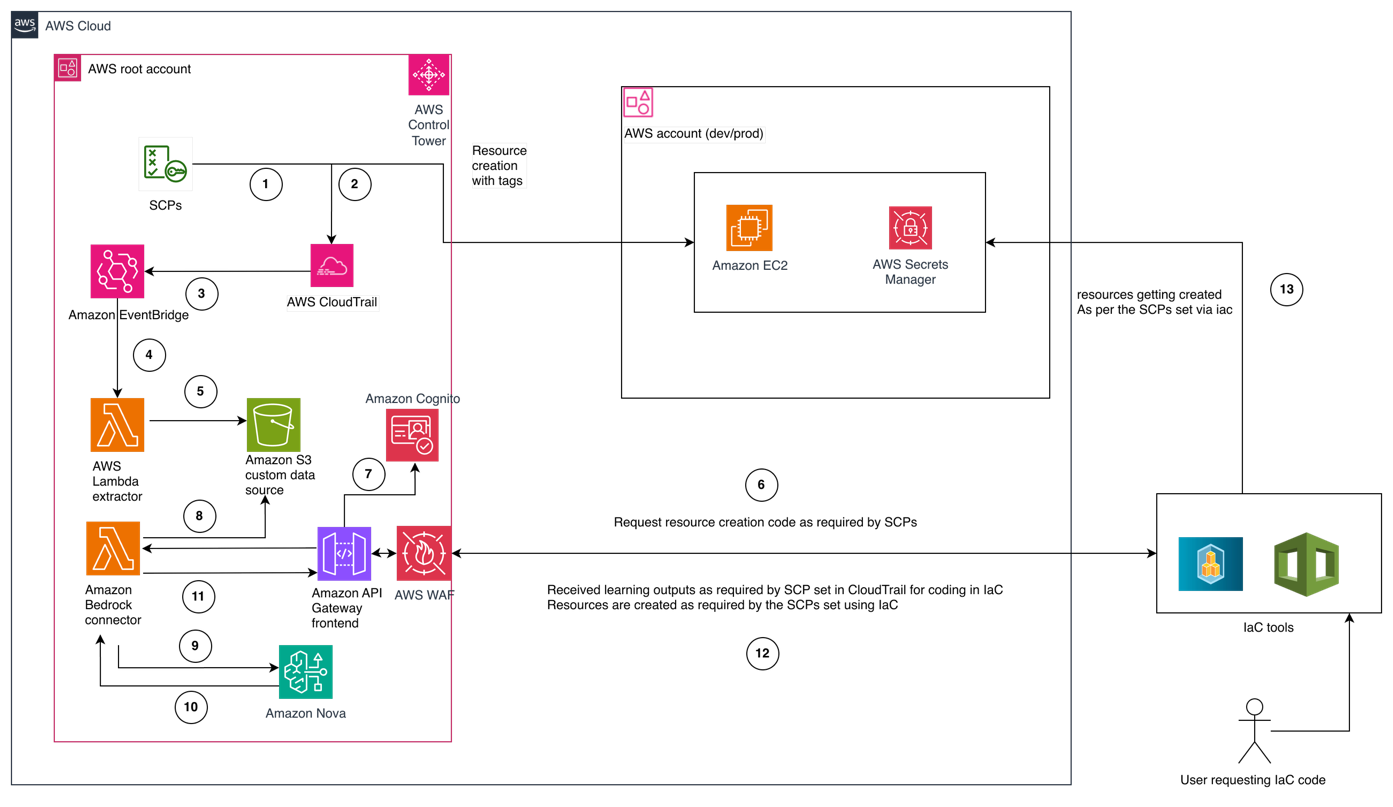 In this post, we explore how you can use generative AI to automate and enhance the creation of SCP-compliant IaC. For this, we’ve used Amazon Bedrock, AWS Lambda functions, and foundation models in our solution. By combining these technologies, you can establish a proactive workflow that makes sure IaC is generated as required by your organizations policies before deployment. This post demonstrate how this generative AI-powered approach can help you to generate IaC that’s compliance-aligned with your organization’s standard SCP.