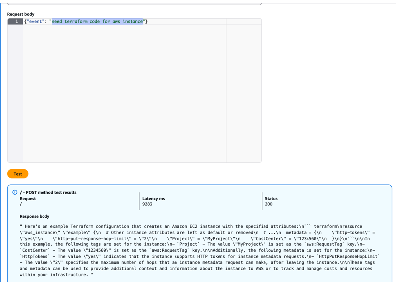 - Response delivery: The context-generating Lambda function performs final validation and formatting of the generated code. The resulting compliance aligned IaC is then securely returned to the developer through API Gateway.