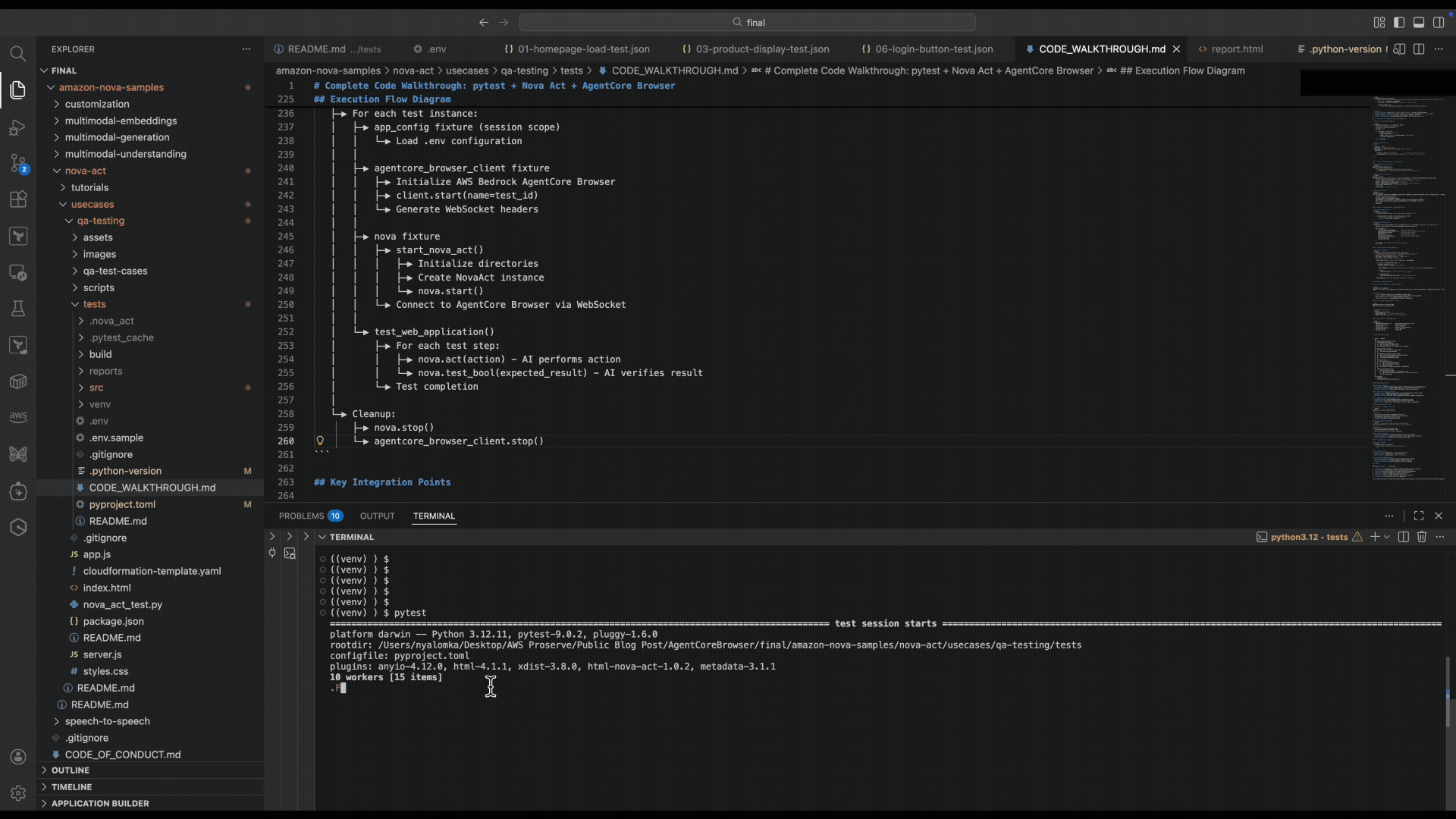 During execution, each test gets its own isolated AgentCore Browser session through the Amazon Nova Act SDK. The Amazon Nova Act agent reads the test steps from the JSON file and executes them—performing actions like clicking buttons or filling forms, then validating that expected results occur. This data-driven approach means teams can create comprehensive test suites by simply writing JSON files, without needing to write Python code for each test scenario. The parallel execution architecture significantly reduces testing time. Tests that would normally run sequentially can now execute simultaneously across multiple browser sessions, with pytest managing the distribution and aggregation of results. An HTML report is automatically generated using pytest-html and the pytest-html-nova-act plugin, providing test outcomes, screenshots, and execution logs for complete visibility into the testing process.