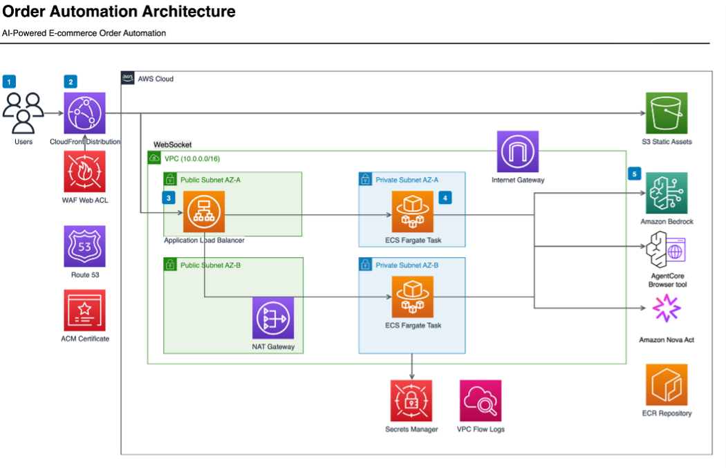 - Application integrates with Amazon Bedrock and Amazon Nova Act for AI-powered order automation. AgentCore Browser Tool provides secure, isolated browser environment for web automation. Main Agent orchestrates Nova Act Agent and Strands + Playwright Agent for intelligent browser control.
