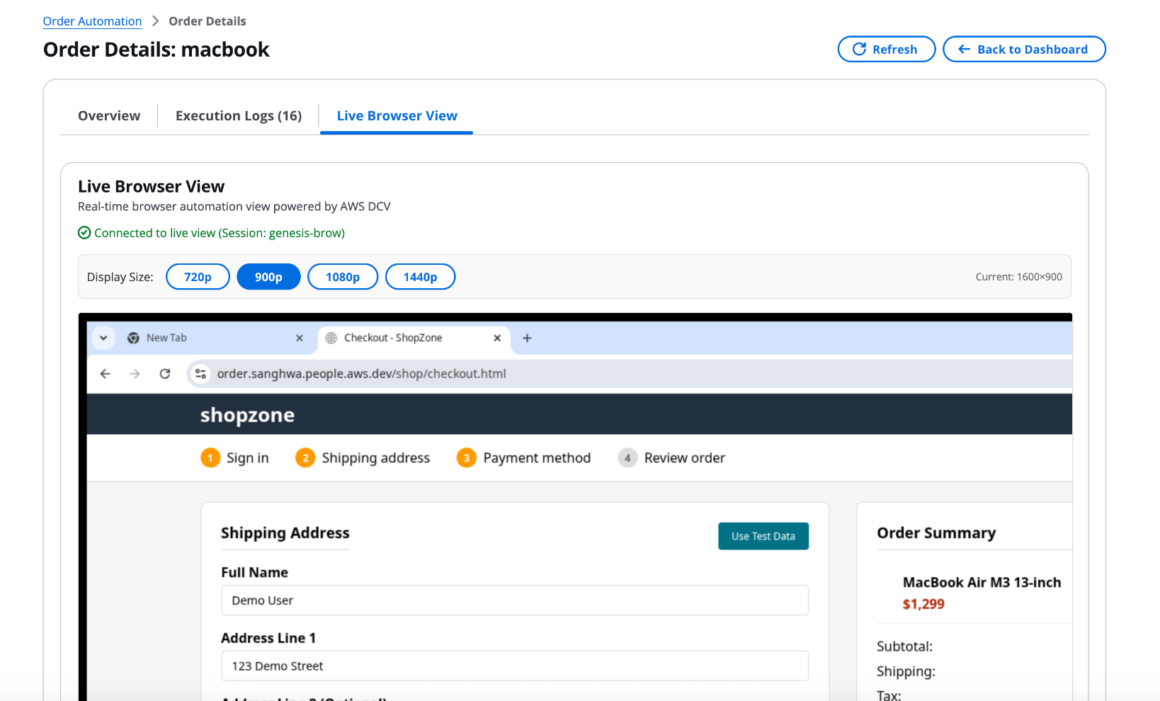 The e-commerce order automation workflow represents a common enterprise challenge where businesses need to process orders across multiple retailer websites without native API access. This workflow demonstrates the full capabilities of AI-powered browser automation, from initial navigation through complex decision-making to human-in-the-loop intervention. We have a sample agentic e-commerce automation built out which we have open sourced on aws-samples repository on GitHub.