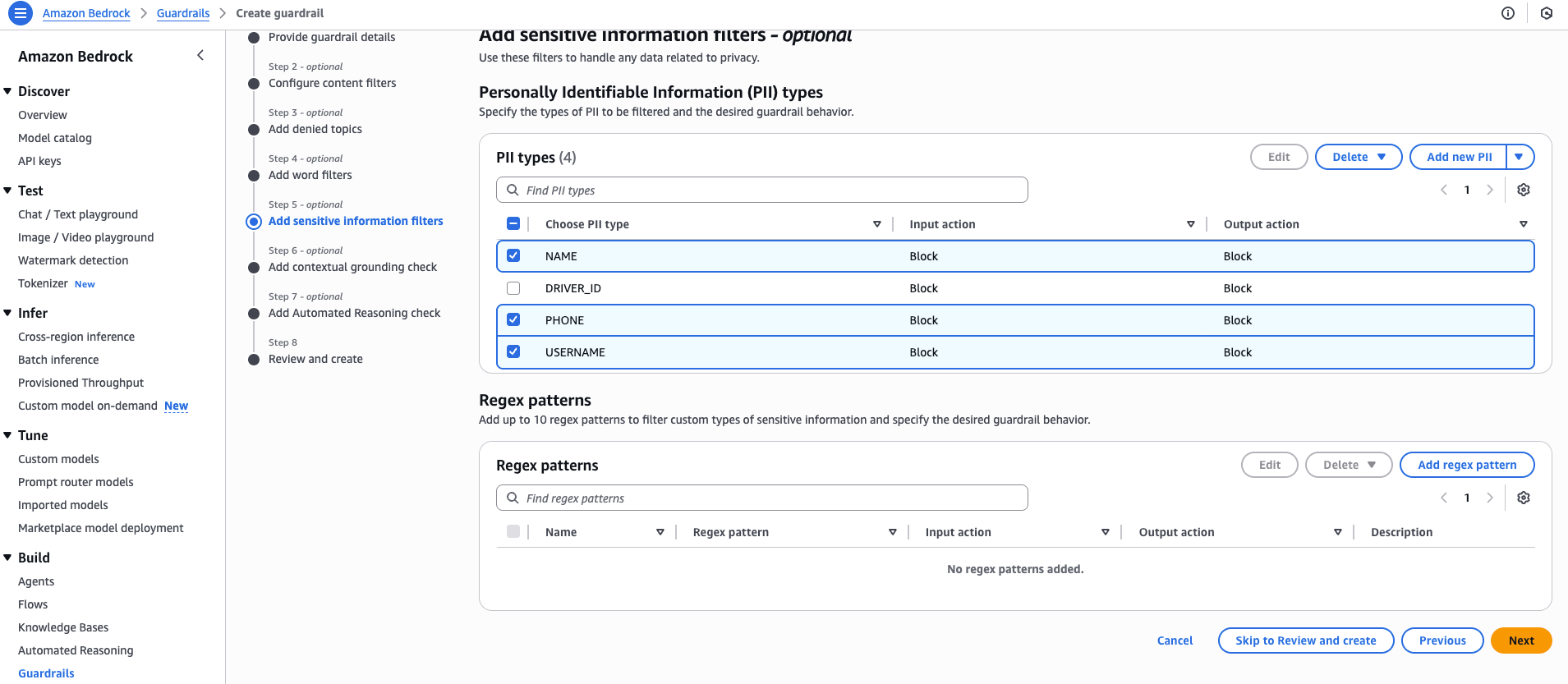 To configure PII protection, navigate to Step 5, Add sensitive information filter in the Bedrock Guardrails console, either choose Add new PII to select specific PII entities, or enable the pre-configured 31 PII types.