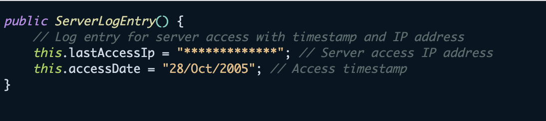 You can also test the sensitive information filter by examining code snippets that may contain protected data. Here’s an example demonstrating sensitive data in a server log entry: