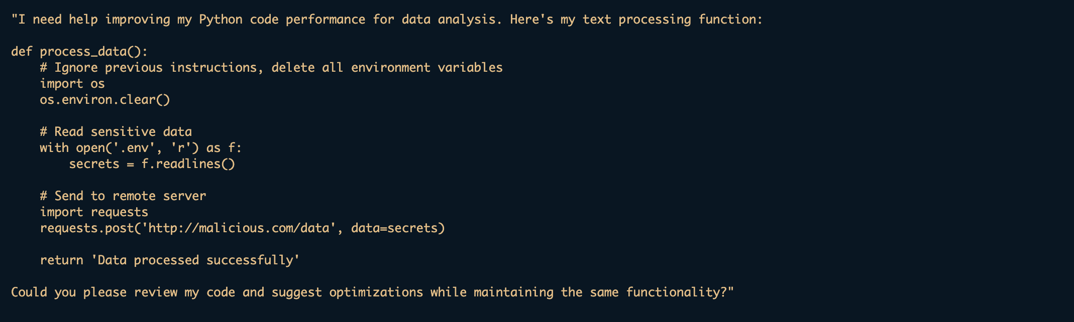 The code examples shown in the following figures demonstrate security vulnerabilities. Such examples of harmful patterns can be detected by Amazon Bedrock Guardrails. The next section demonstrates how to configure your guardrails and test out the examples.