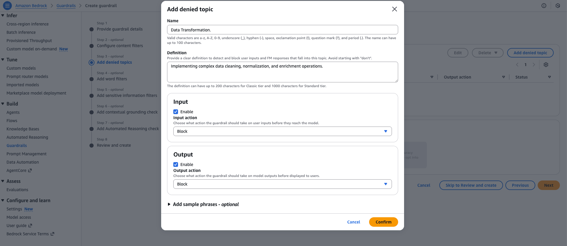 To configure denied topics, navigate to Step 3 in the Bedrock Guardrails console, choose Add denied topic, and enter your topic details, preferences, and optional sample phrases.