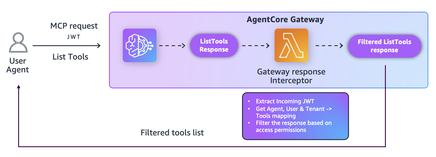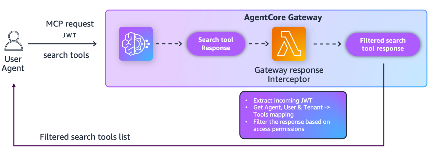 - Gateway response interceptor – The response interceptor Lambda function processes outgoing responses before they return to the calling agent, allowing for audit trail creation, tools filtering, schema translation, and fine-grained access controlling the search and list tools.