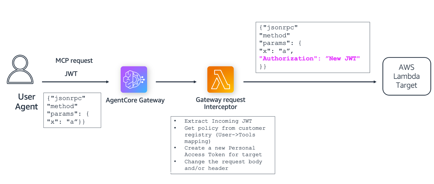 - The gateway request interceptor transforms the incoming request payload by adding an authorization token as a parameter to send to the downstream Lambda target. (We don’t recommend sending the incoming JWT as-is to downstream APIs because it’s insecure due to the risk of privilege escalation and stolen credentials. However, there might be exceptions where the agent needs to call the MCP server with an access token for downstream APIs.) Alternatively, you can remove the inbound JWT coming from the request and add a new JWT with a least-privileged scoped-down token for calling relevant downstream APIs.
