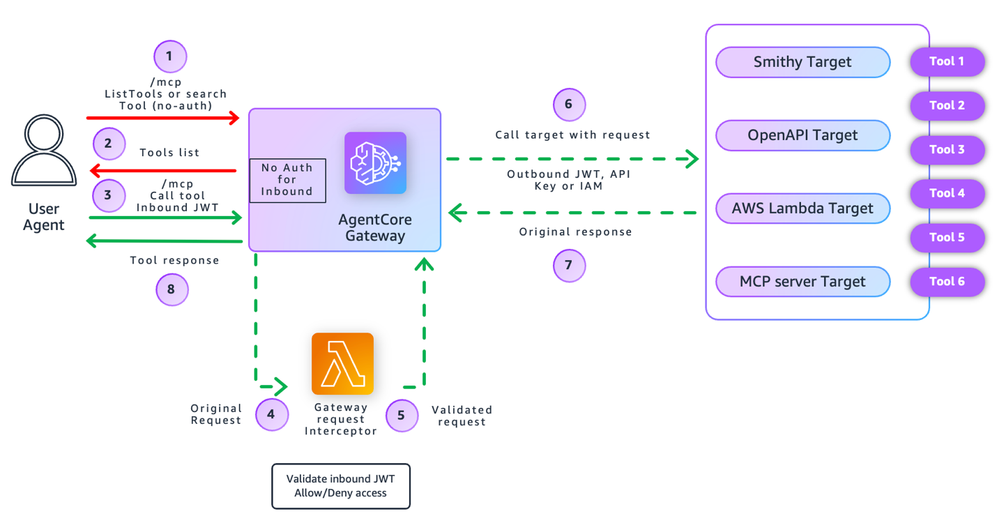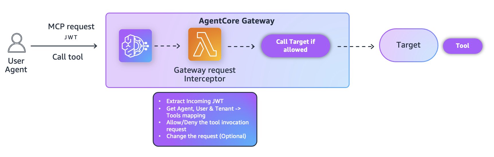 - AgentCore Gateway orchestrates the request flow and manages interceptor execution.