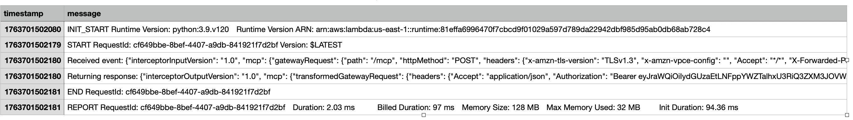 - Downstream tool observability – Interceptors log downstream tool behavior, including status codes, latency, and error responses. This creates consistent visibility across targets, helping teams troubleshoot failures, identify reliability issues, and understand end-to-end execution characteristics.