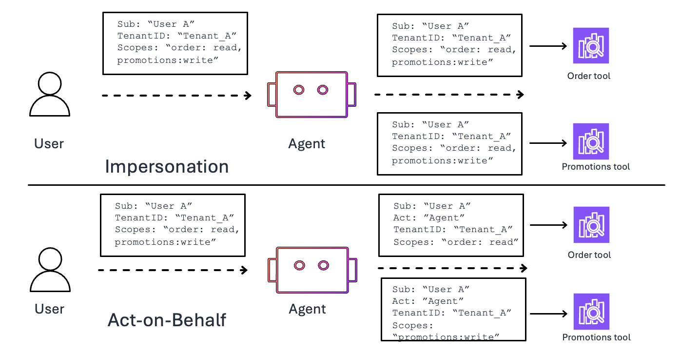 Customers face a fundamental security decision in how identity context propagates through multi-hop workflows (agent to agent to tool to API): using an impersonation approach or an act-on-behalf approach.
