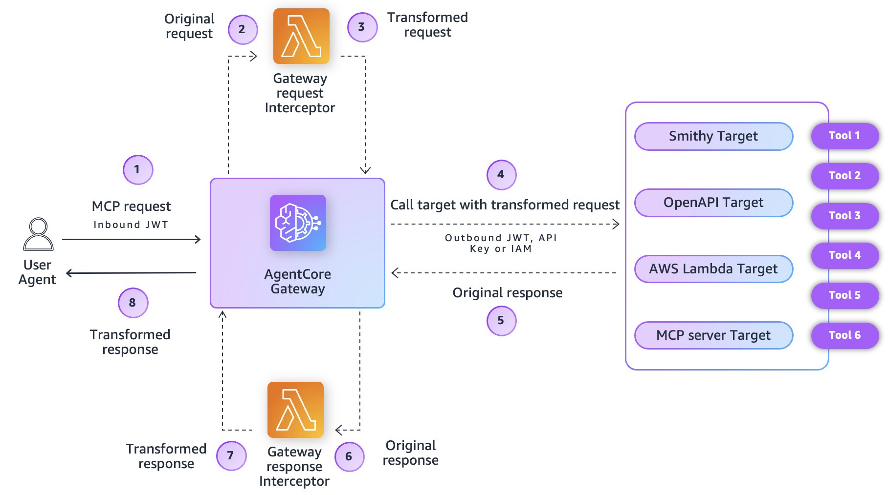 Gateway interceptors work with AgentCore Gateway target types: including Lambda functions, OpenAPI endpoints, and MCP servers.