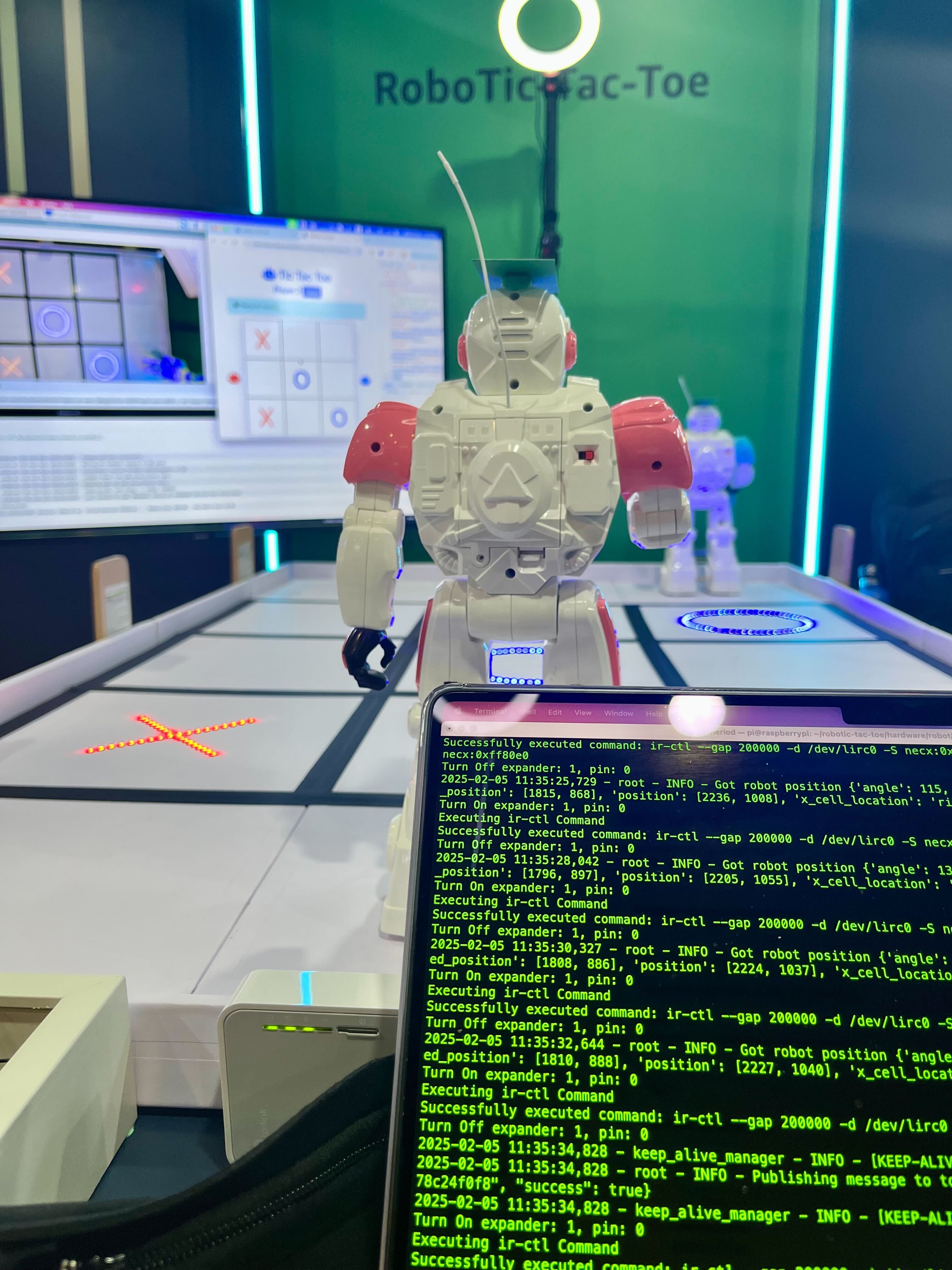 When a player chooses a target cell, the two robots, positioned beside a tic-tac-toe board, respond to commands by executing precise movements to place X or O markers. The following video shows this in action.