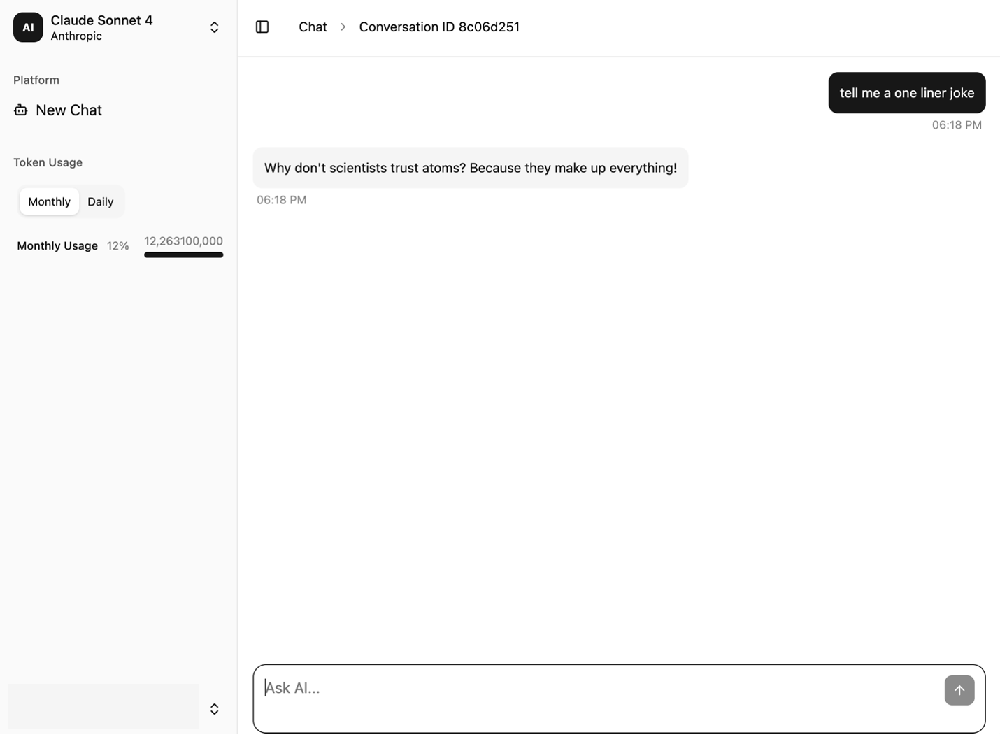 - A Token Usage section is displayed and updated with each turn of the conversation
