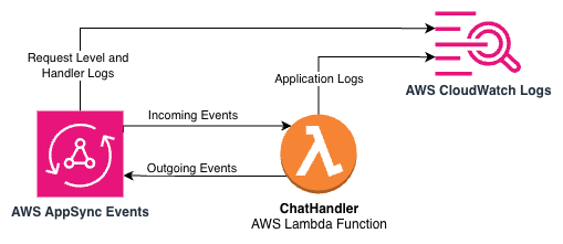 In the sample AI Gateway architecture, CloudWatch Logs is integrated at multiple levels to provide comprehensive visibility. The following architecture diagram depicts the integration points between AppSync Events, Lambda, and CloudWatch Logs in the sample application.