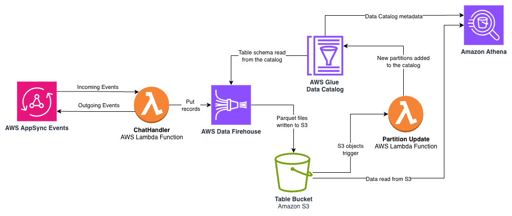 ChatHandlerLambda function streams structured log data to a Firehose delivery stream at the end of each completed user response. Data Firehose provides a fully managed service that automatically scales with your data throughput, alleviating the need to provision or manage infrastructure. The following code illustrates how the API call that integrates theChatHandlerLambda function with the delivery stream: