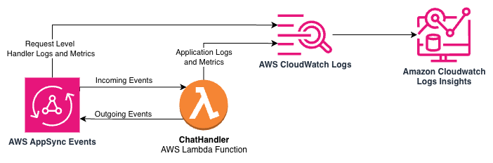 The sample application includes a call to CloudWatch metrics to record the token consumption and LLM latency at the end of each conversation turn so operators have visibility into this data in real time. This enables metrics to be included in dashboards and alerts. Moreover, the metric data includes the LLM model identifier as a dimension so you can track token consumption and latency by model. Metrics are just one component of what we can learn about our application at runtime with CloudWatch. Because our log messages are formatted as JSON, we can perform analytics on our log data for monitoring using CloudWatch Logs Insights. The following architecture diagram illustrates the logs and metrics made available by AppSync Events and Lambda through CloudWatch and CloudWatch Logs Insights.