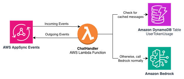 The sample application computes a hash on the user message to query a DynamoDB table with stored messages. If there is a message available for a hash key, the application returns the text to the user, the custom metrics record a cache hit in CloudWatch, and an event is passed back to AppSync Events to notify the application the response is complete. This encapsulates the cache behavior completely within the event structure the application understands.
