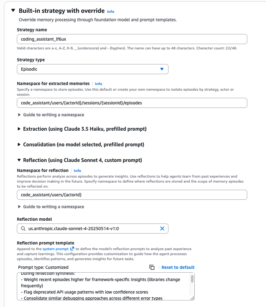 _memory_resource_as a strategy override or through the Amazon Bedrock AgentCore console (as shown in the following screenshot). - Namespaces: Namespaces provide a hierarchical organization for episodes and reflections, enabling access to your agent’s experiences at different levels of granularity and providing a seamless natural logical grouping. For instance, to design a namespace for a travel application, episodes could be stored under