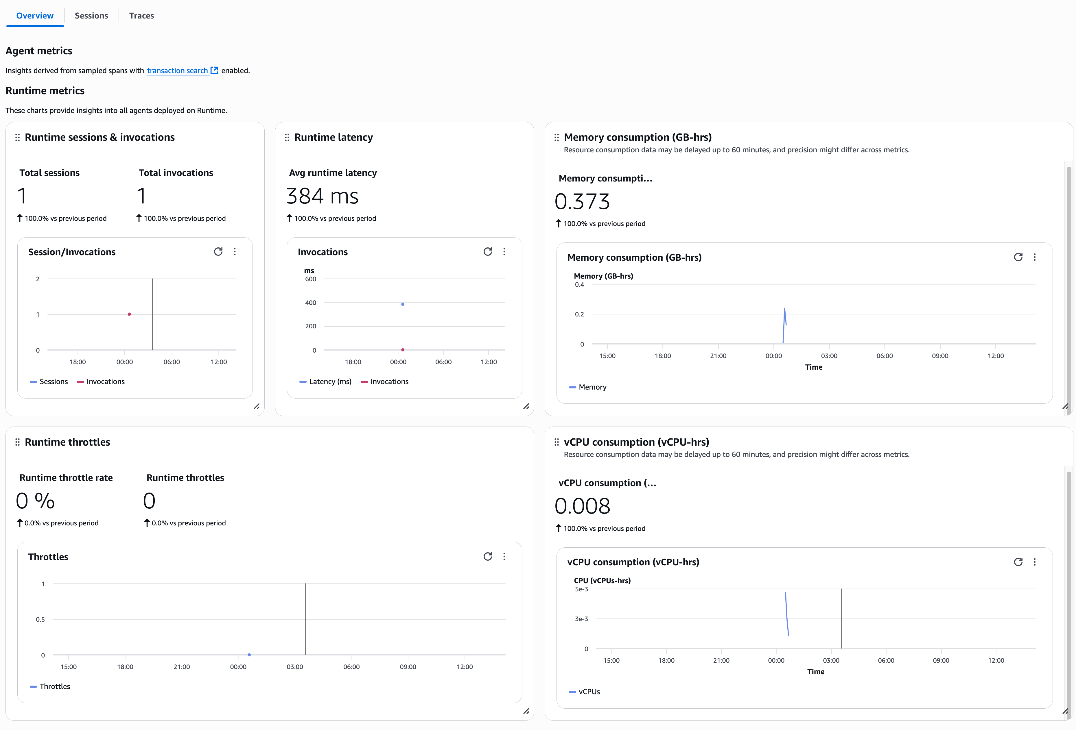 The following screenshot shows metrics in the AgentCore Runtime UI.