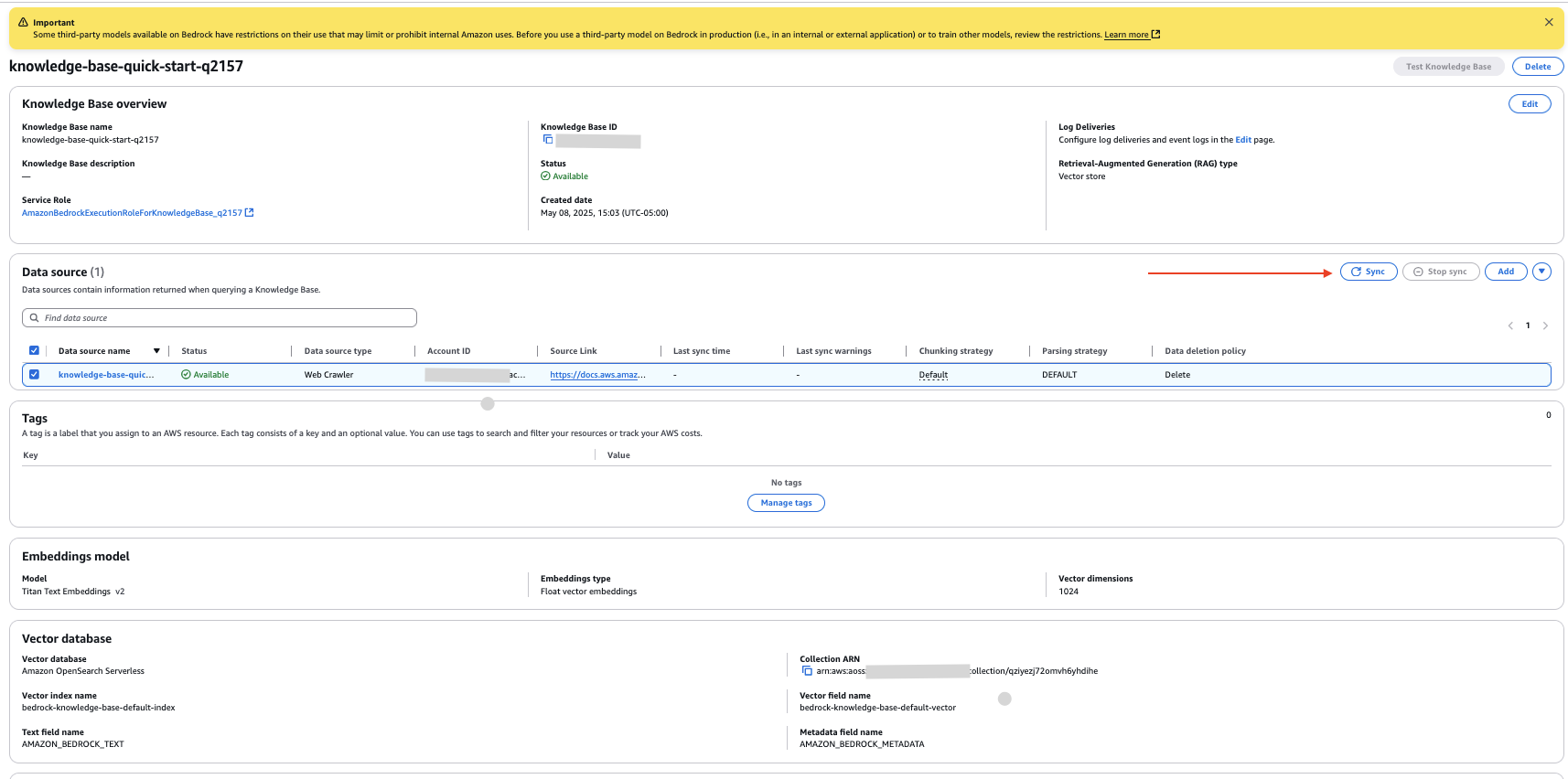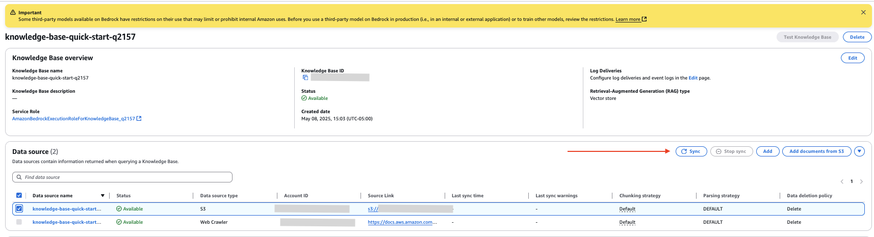 - In the Data source section of the knowledge base details page, select your new data source and choose Sync to index the data from the documents in the S3 bucket.