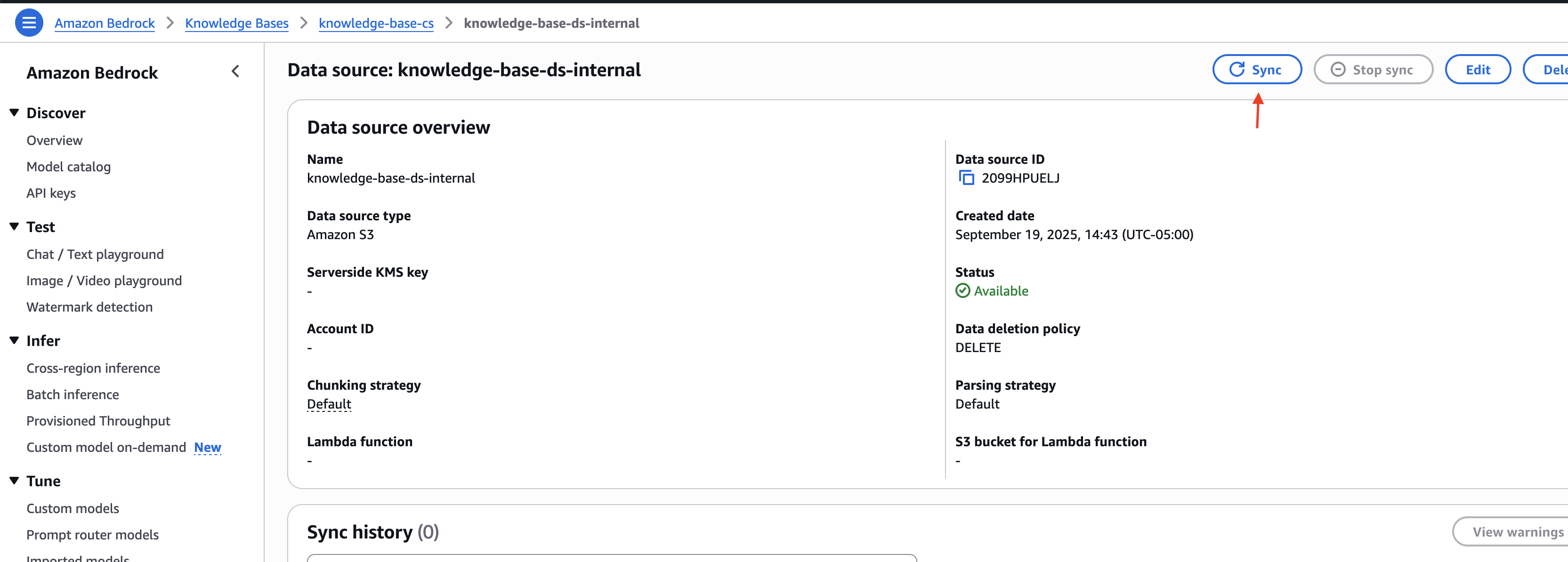 - Choose the internal data source you created and choose Sync to sync the uploaded document with the vector store.