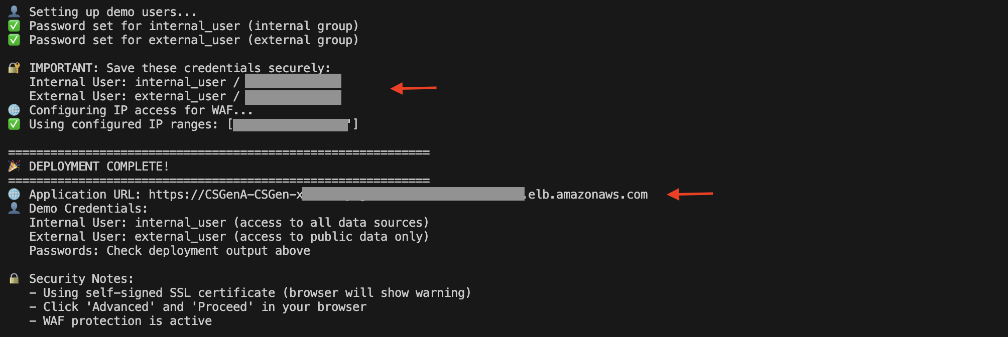 When the deployment is complete, you can find the Application Load Balancer (ALB) URL and demo user details in the script execution output.