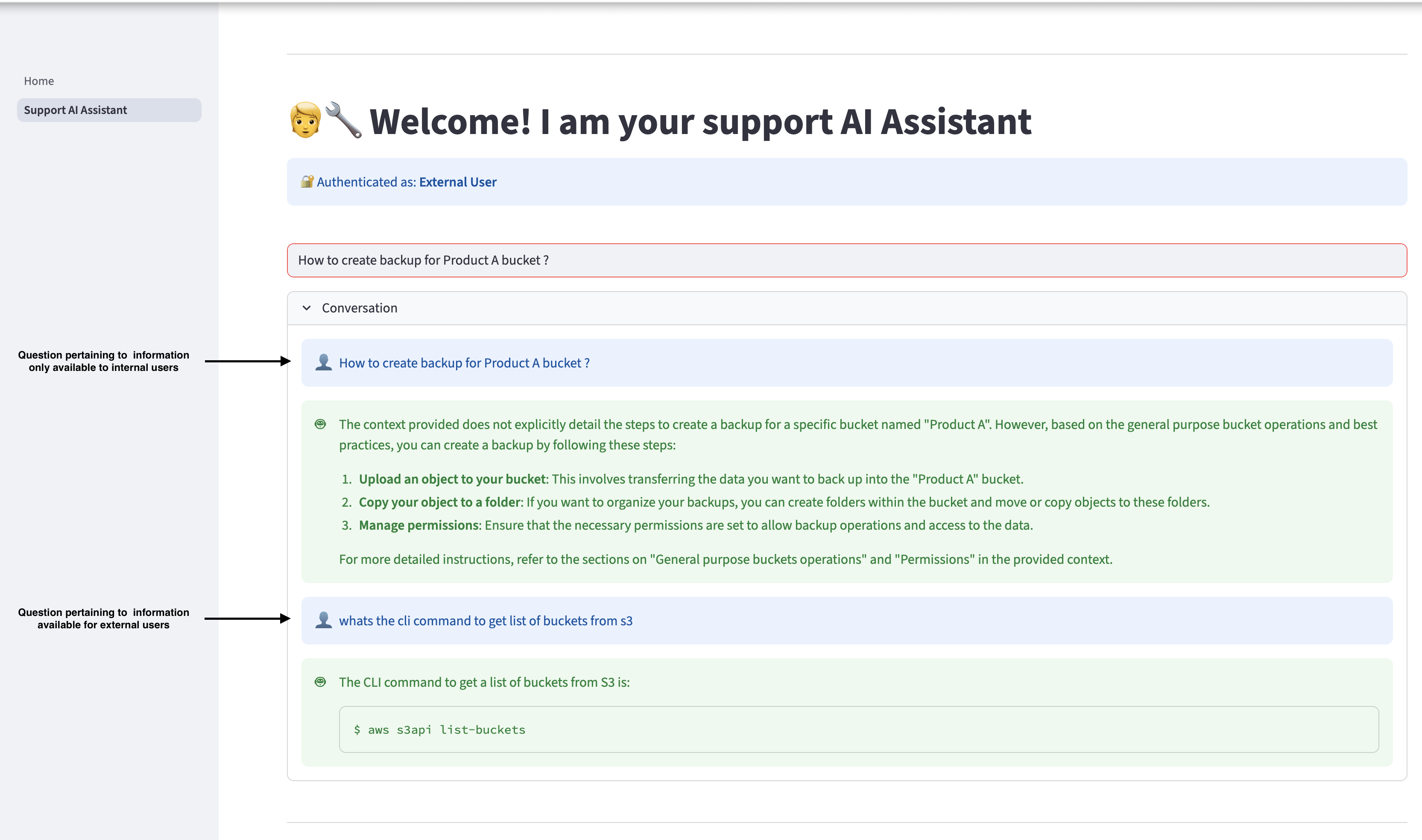 Let’s explore an example of Amazon S3 service support. This solution supports different classes of users to help resolve their queries while using Amazon Bedrock Knowledge Bases to manage specific data sources (such as website content, documentation, and support tickets) with built-in filtering controls that separate internal operational documents from publicly accessible information. For example, internal users can access both company-specific operational guides and public documentation, whereas external users are limited to publicly available content only.