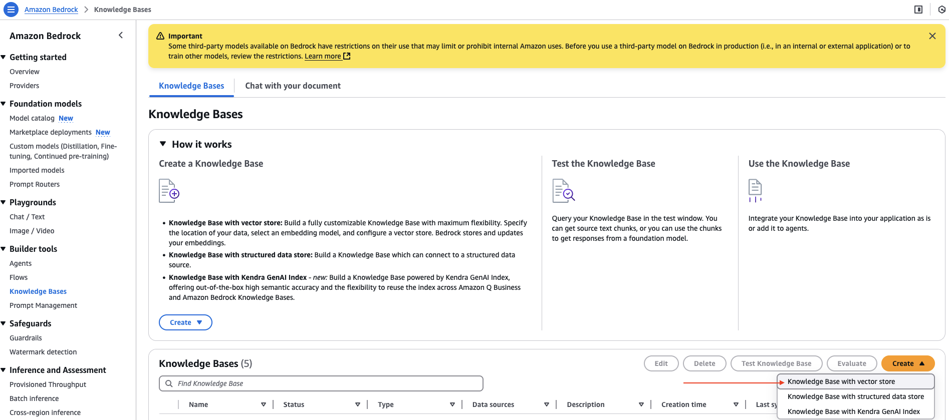 - On the Create dropdown menu, choose Knowledge Base with vector store.