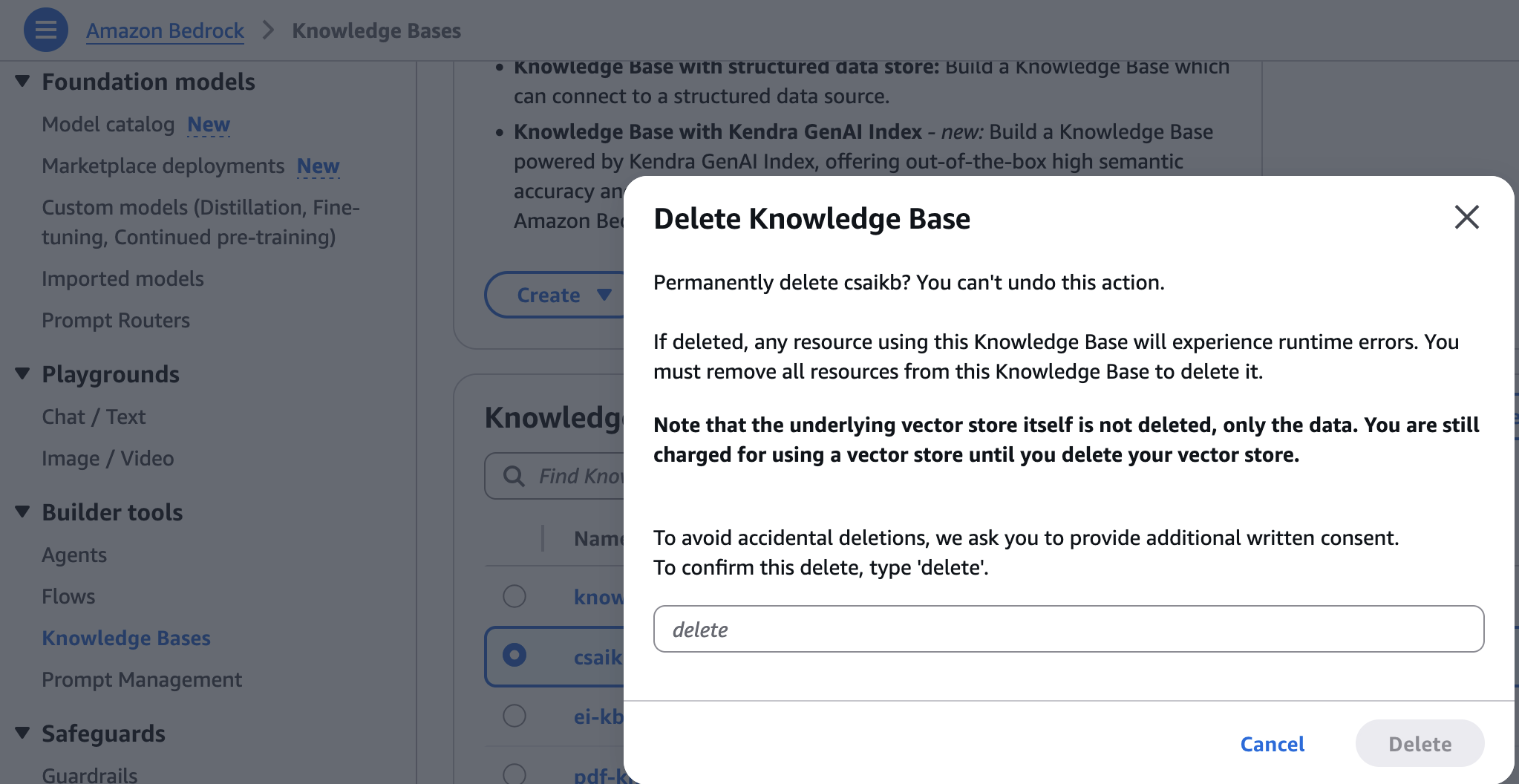 - On the Amazon Bedrock console, choose Knowledge Bases under Builder tools in the navigation pane.