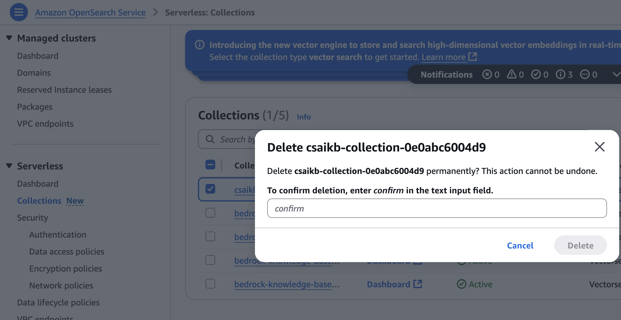 - Choose the collection created during infrastructure provisioning, then choose Delete.