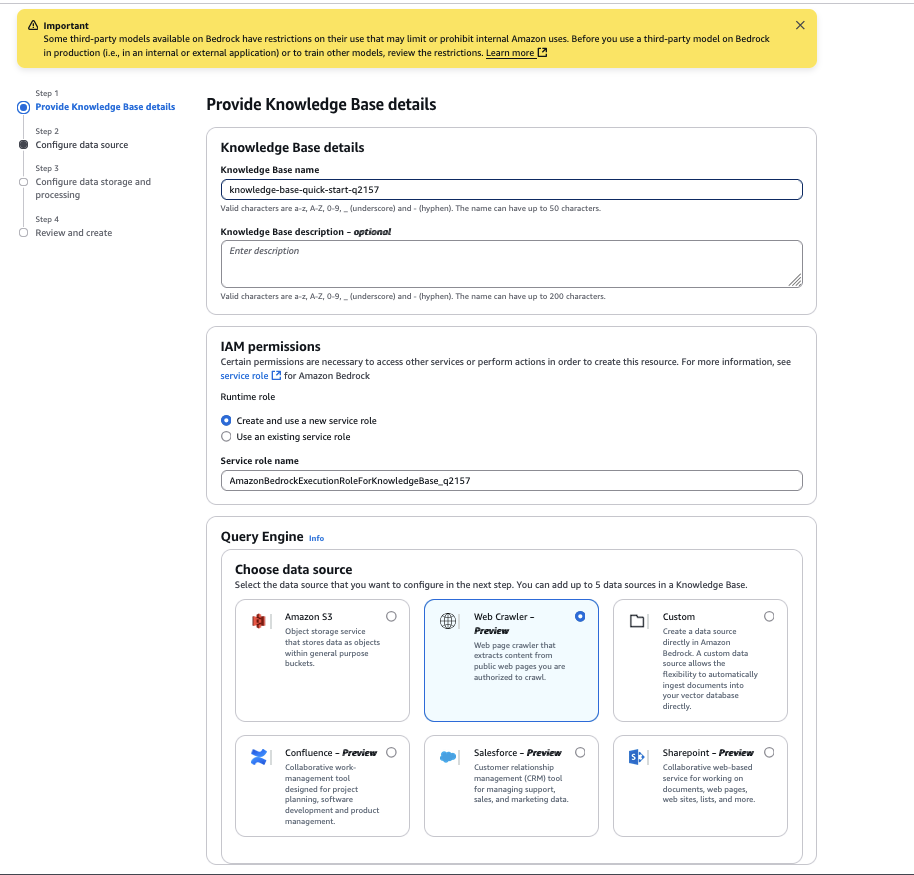 The first step is to build a knowledge base to ingest data from a website and operational documents from an S3 bucket. Complete the following steps to create your knowledge base:
