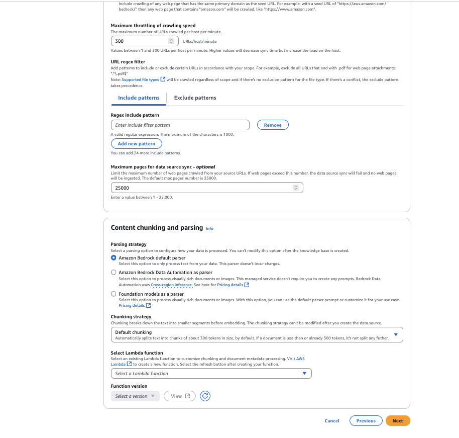 - For Chunking strategy, you can configure the content parsing options to customize the data chunking strategy. For this example, we leave it as Default chunking.