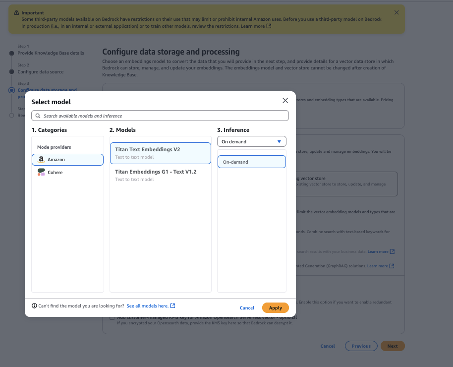 - Choose the Amazon Titan Text Embeddings V2 model, then choose Apply.