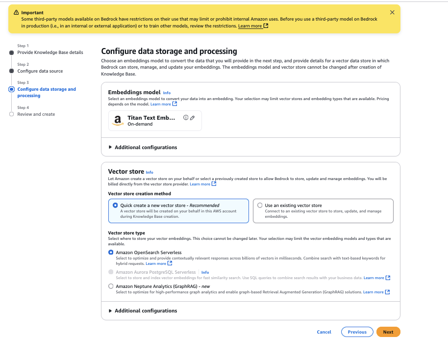 - For Vector store type, select Amazon OpenSearch Serverless, then choose Next.
