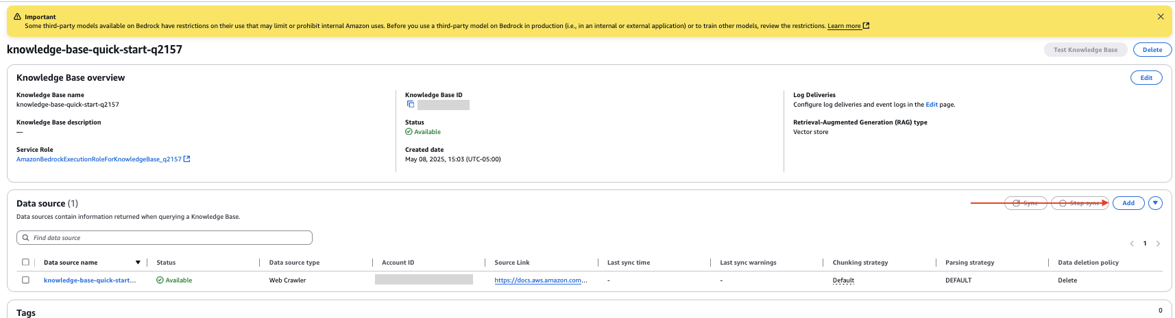 - On the knowledge base details page, select your new data source and choose Sync to crawl the website and ingest the data.