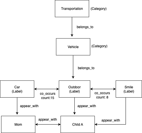 Label hierarchies and co-occurrence patterns are automatically generated during image processing. Amazon Rekognition provides category classifications that create the belongs_to relationships, and the appears_with and co_occurs_with relationships are built dynamically as images are processed.