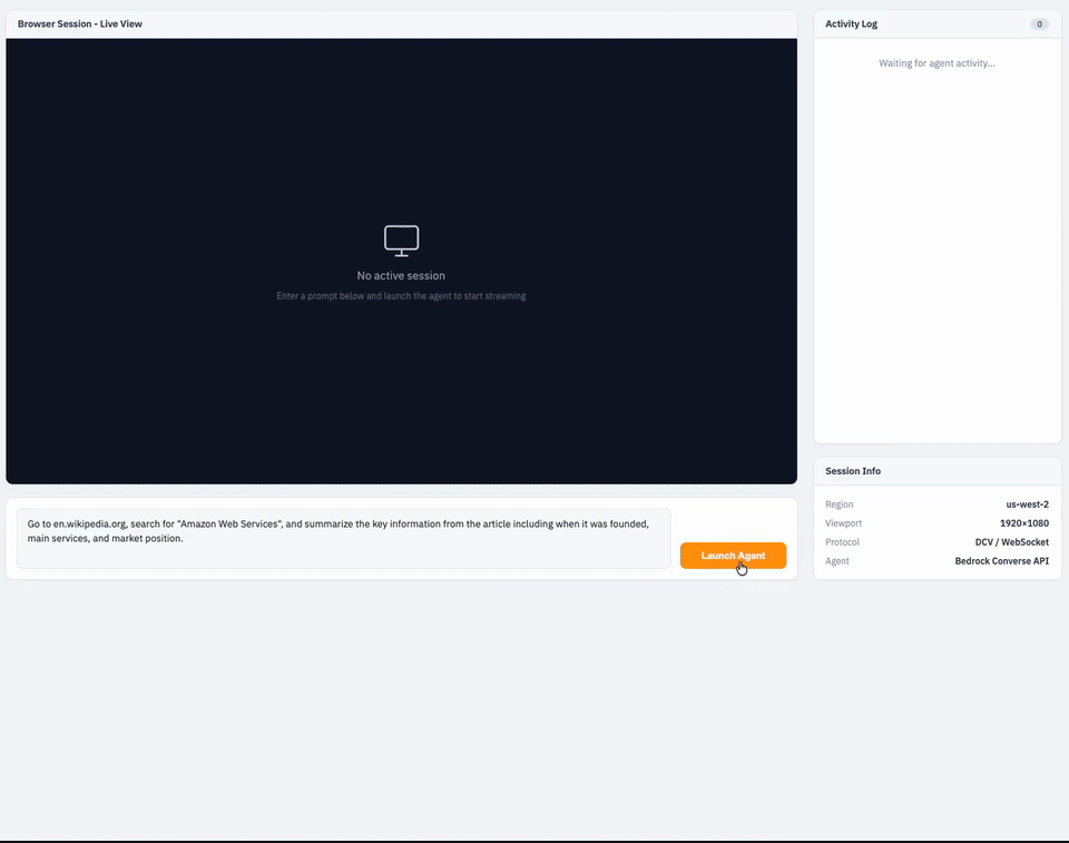 The model is configurable. You can use Anthropic Claude, Amazon Nova, or an Amazon Bedrock model that supports tool use. Every tool call that the model makes is visible to your user through the Live View. They see the browser navigate, the search box fill in, and the results page load.