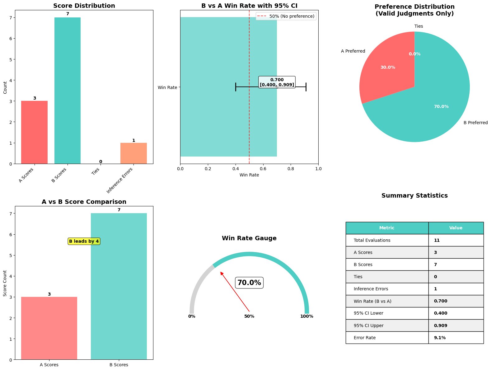 - Summary statistics table – Compiles numerical metrics into a compact, clean table: 11 total evaluations, one error (9.1% error rate), 70% win rate, weighted rubric scores (0.630 for B vs 0.495 for A with -0.135 margin), and confidence intervals [0.400, 0.909]. This makes it straightforward to reference the exact numeric values behind the plots and understand both the statistical rigor and rubric-based assessment of the evaluation.
