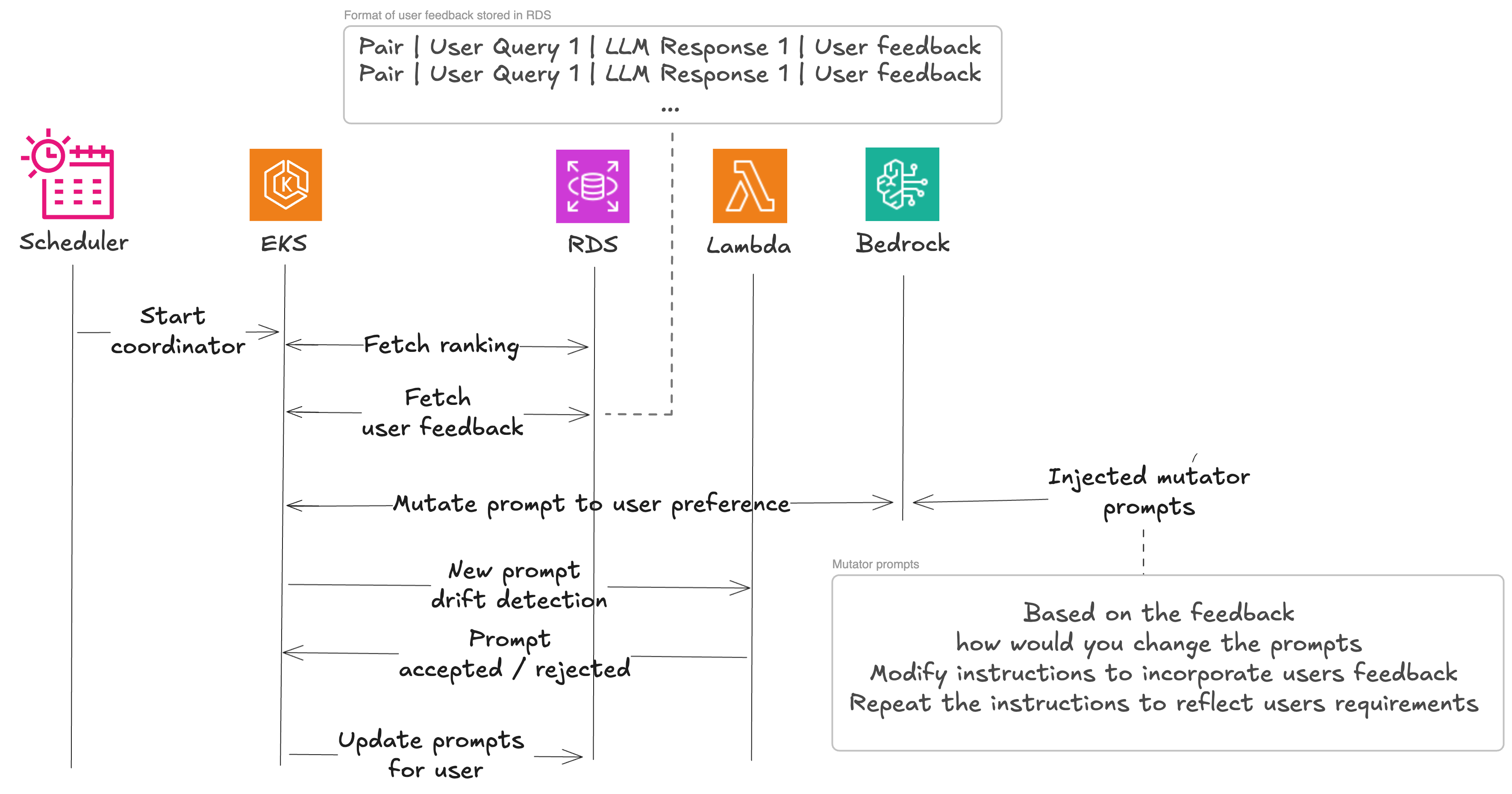 The workflow begins with a synthetic rank creator that establishes baseline performance. A scheduler triggers the coordinator, which fetches test data and sends it to evaluators. These evaluators test each model/prompt pair and return results, with a portion sent for manual validation. The system mutates promising prompts to create variations, evaluates these again, and saves the best performers. When user feedback arrives, the system incorporates it through a second phase. The coordinator fetches ranked model/prompt pairs and sends them with user feedback to a mutator, which returns personalized prompts. A drift detector makes sure these personalized versions don’t stray too far from quality standards, and validated prompts are saved for specific users.