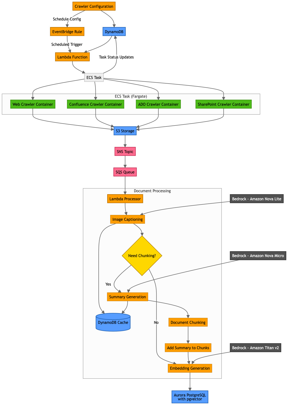 - Crawlers – AWS Lambda invokes crawlers that are executed as tasks by Amazon Elastic Container Service (Amazon ECS).