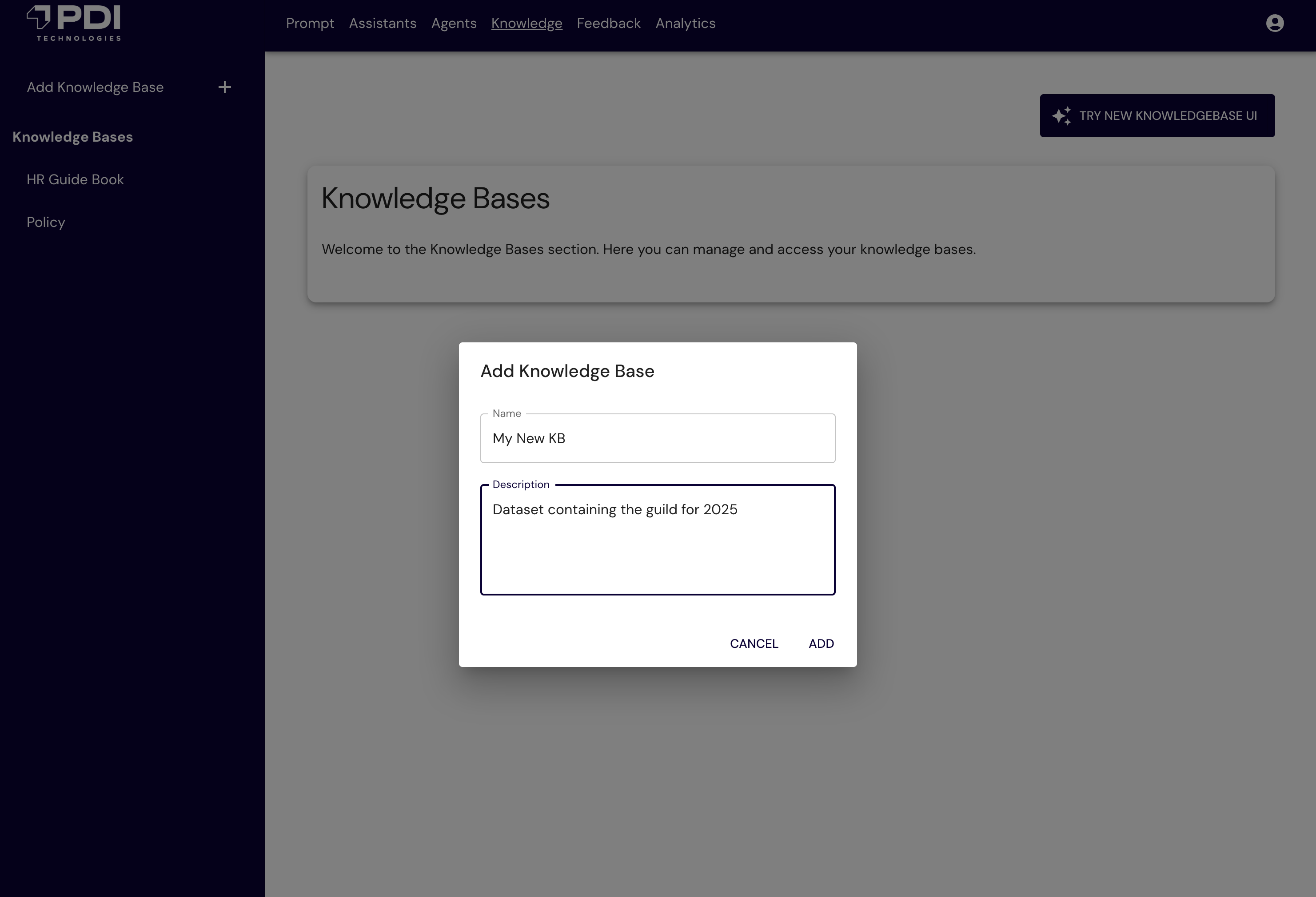 The following figure shows the PDIQ UI to configure the knowledge base.