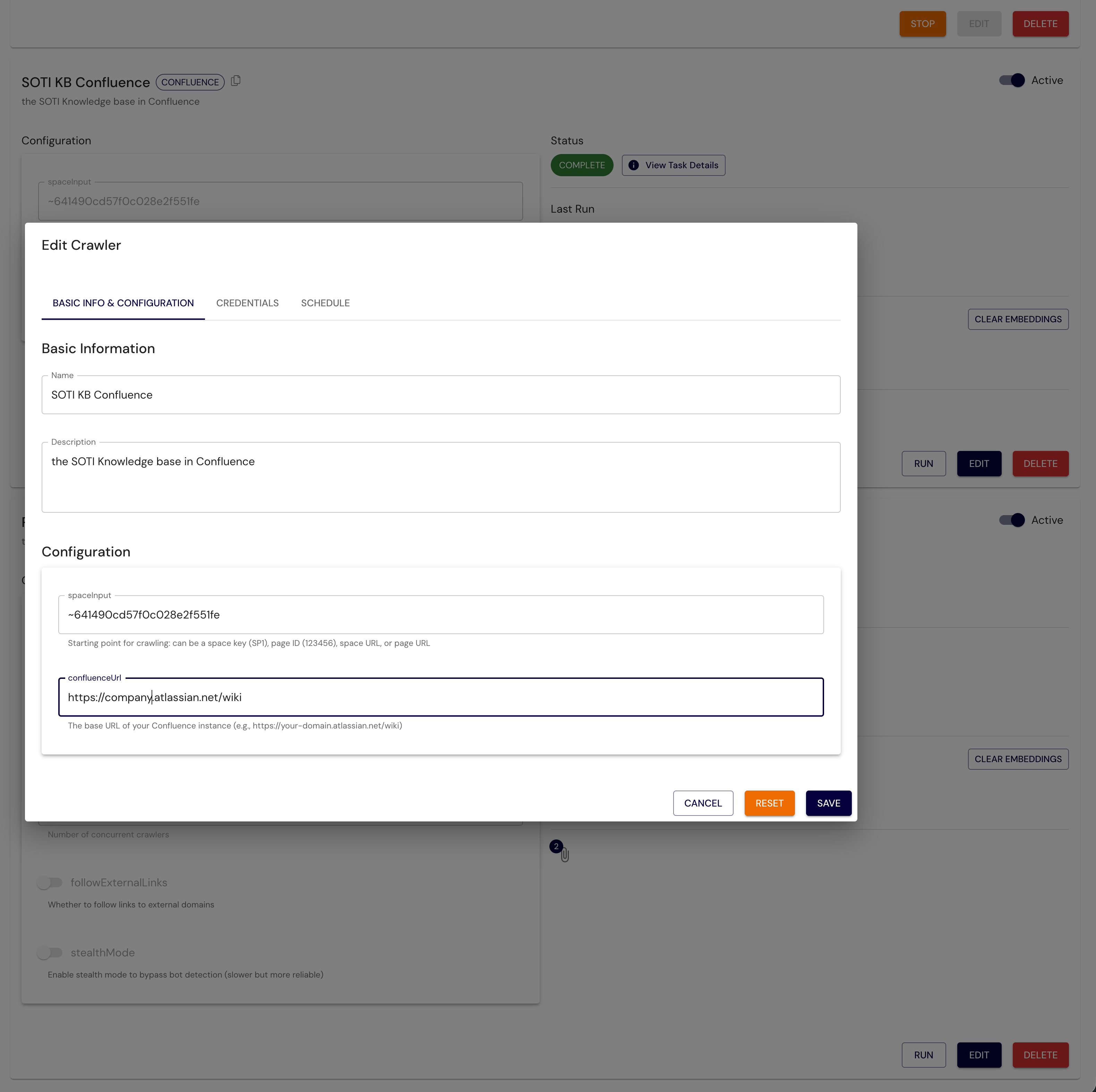 The following figure shows the PDI UI to configure your crawler (such as Confluence).