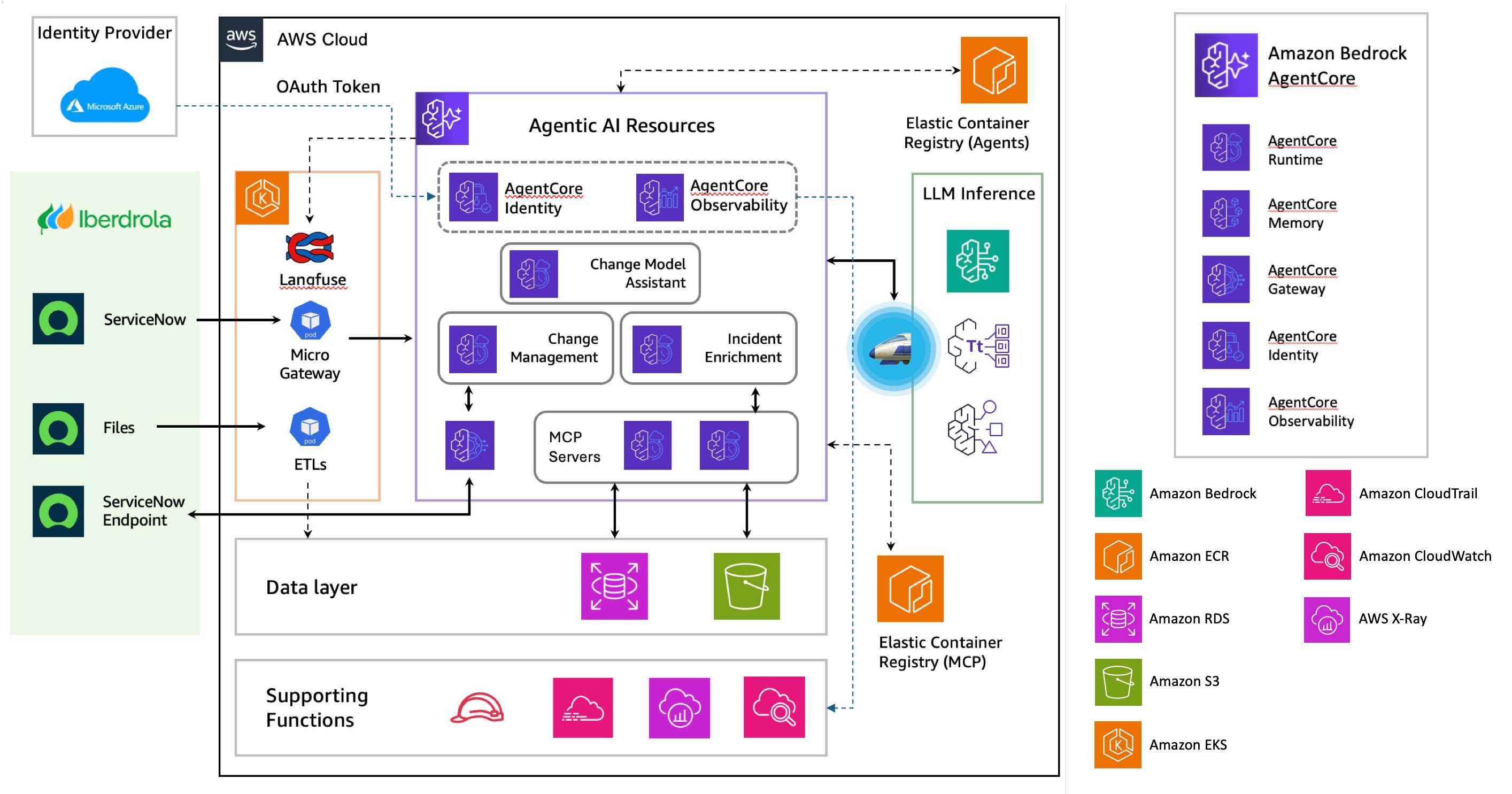 Through its partnership with AWS, Iberdrola implemented those agents in a groundbreaking solution using Amazon Bedrock AgentCore, targeting three key areas: optimizing change request validation in the draft phase, enriching incident management with contextual intelligence, and simplifying change model selection using conversational AI. These innovations reduce bottlenecks, help teams accelerate ticket resolution, and deliver consistent and high-quality data handling throughout the organization.