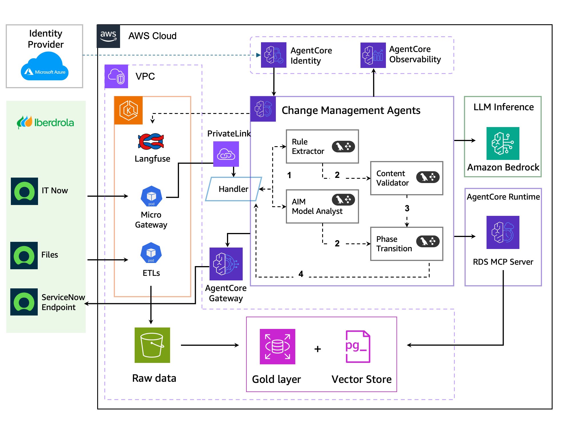 The architecture addresses Iberdrola’s enterprise security requirements through a virtual private cloud (VPC) configuration within AgentCore Runtime, so agents can securely access internal resources while maintaining network isolation. VPC endpoints provide secure communication with internal data sources without exposing traffic to the public internet.